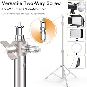 【Versatile Screw & Two-Way Options】Equipped with a 1/4″ and 3/8″ adapter, this studio lighting stand is well-suited to strobe lights, reflectors, umbrellas, softboxes, speedlights, flashlights, spotlights and DSLR cameras. Moreover, choose between top-mounted or side-mounted installation for flexible lighting direction, catering to your unique shooting needs.