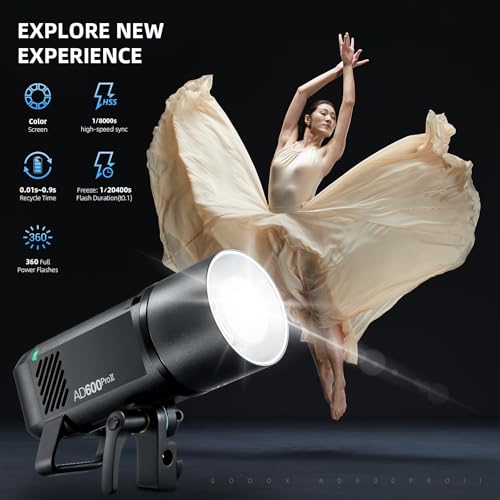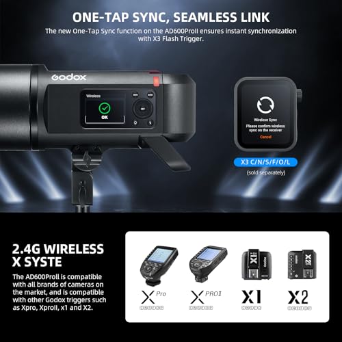 Professional Strobe: Godox AD600Proii All-in-One outdoor flash integrates with X3 trigger, group identification indicator, and an optimized color screen. It boasts upgrades in flash duration, battery life, and wider output range; With Godox 2.4G system, the studio strobe compatible for Canon, Nikon, Sony, Olympus, Panasonic, FUJIFILM, Pentax, Leica